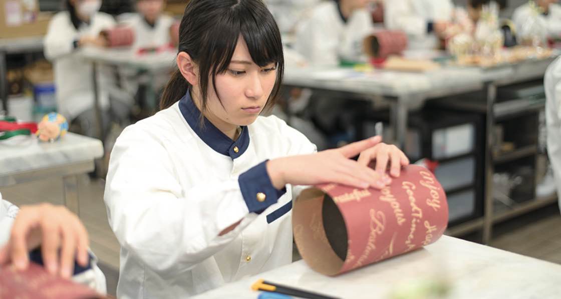 学⽣にはお菓⼦づくりの楽しさを伝えると同時に緊張感のある授業で、挨拶や返事、⽚付け、清掃も厳しく指導し、とくに学園祭前には厳しい⽬で製品づくりをチェックします。そのかわり、休憩中や放課後は学⽣と専任教師の仲も良く、なんでも相談できる関係づくりを⼼がけています。