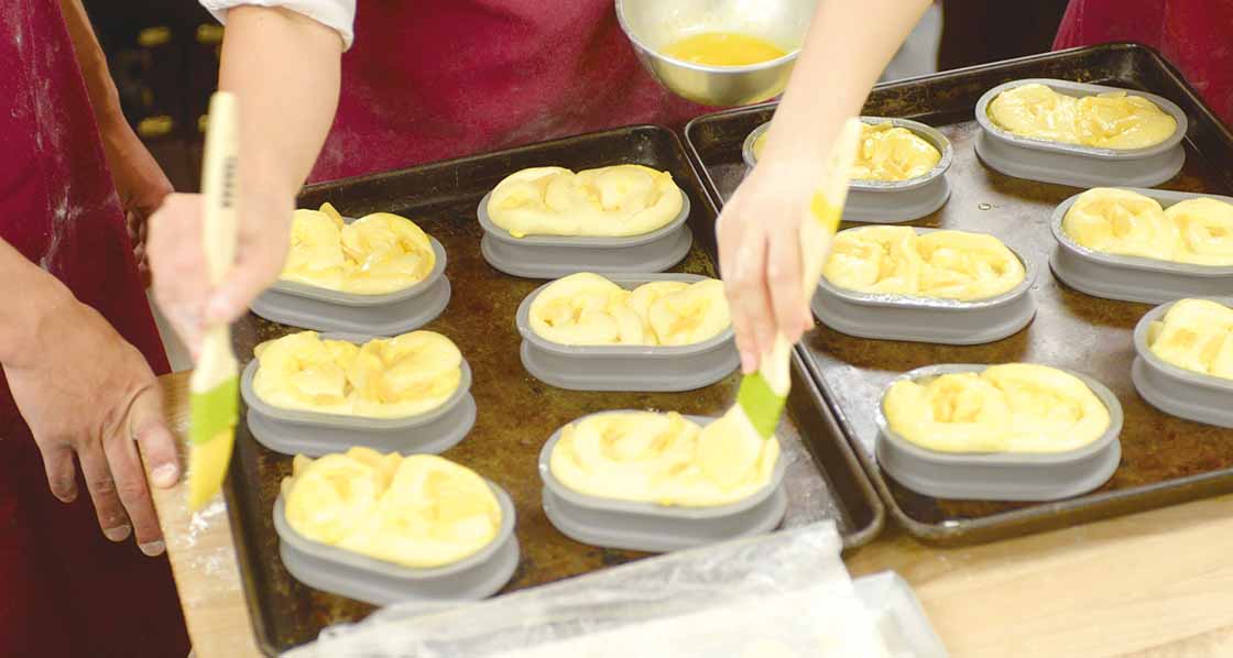 1日の実習で3~4種類以上の製品をつくります。パン生地を発酵させる間に別のパンのフィリングを仕込み、焼成の間にまた別のパンを成形...と、常に次を考えながら進みます。ただ製法を教えるのではなく、各工程の意味、ロスを減らす方法や効率のよい動作など、実践的な指導をします。