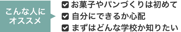 コース洋菓子・和菓子・製パンからコースを選んで、お菓子づくり・パンづくりを体験できます。はじめての人でも大丈夫!教師と在校生がわかりやすく丁寧にサポートします。