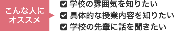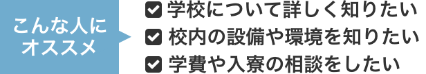 コースはじめて学校に来る人や、授業内容、卒業後の進路、学費などについて詳しく知りたい人におすすめ!遠方からの参加者にも大好評のコースです。