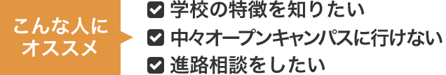 コース遠方にお住まいの人や忙しい人におすすめ!オンラインで学校説明だけではなく進路相談や入試相談もできるコースです。