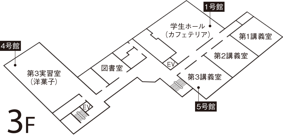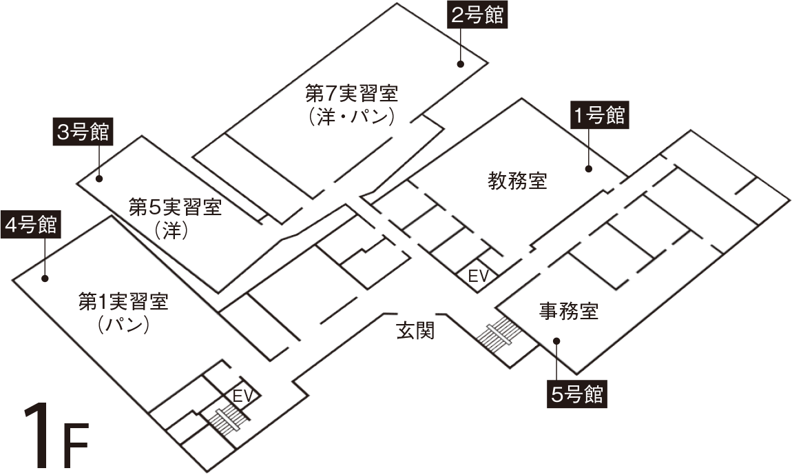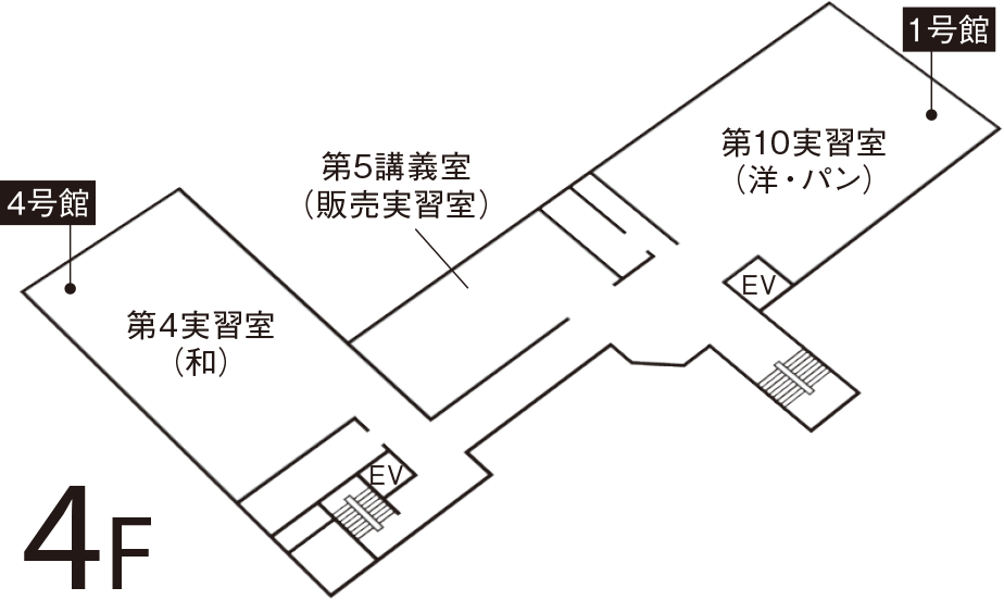 1年次は開放的な広い作業スペースで調理できる実習室、2年次は現場を意識した実習室で学びます。実習室と階段教室が組み合わさった教室もあり、主に講師の実習のときに使用します。